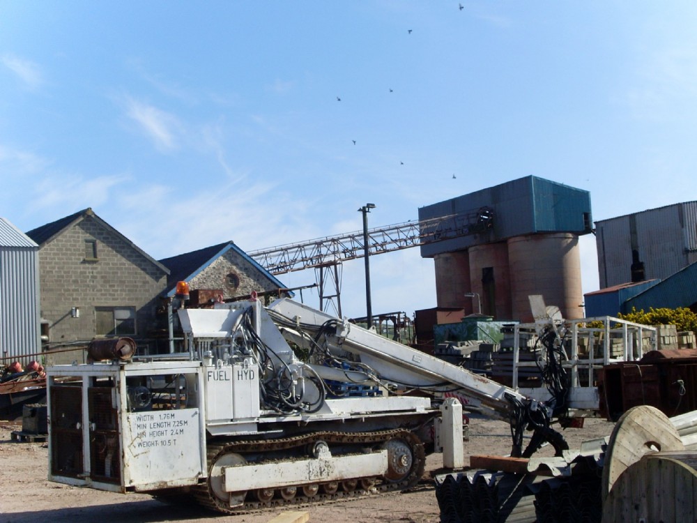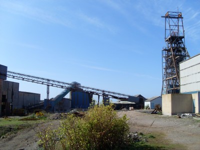In this view can be seen a cherry picker in the foreground, the compressor sheads, the ore bins and the edge of the mill.