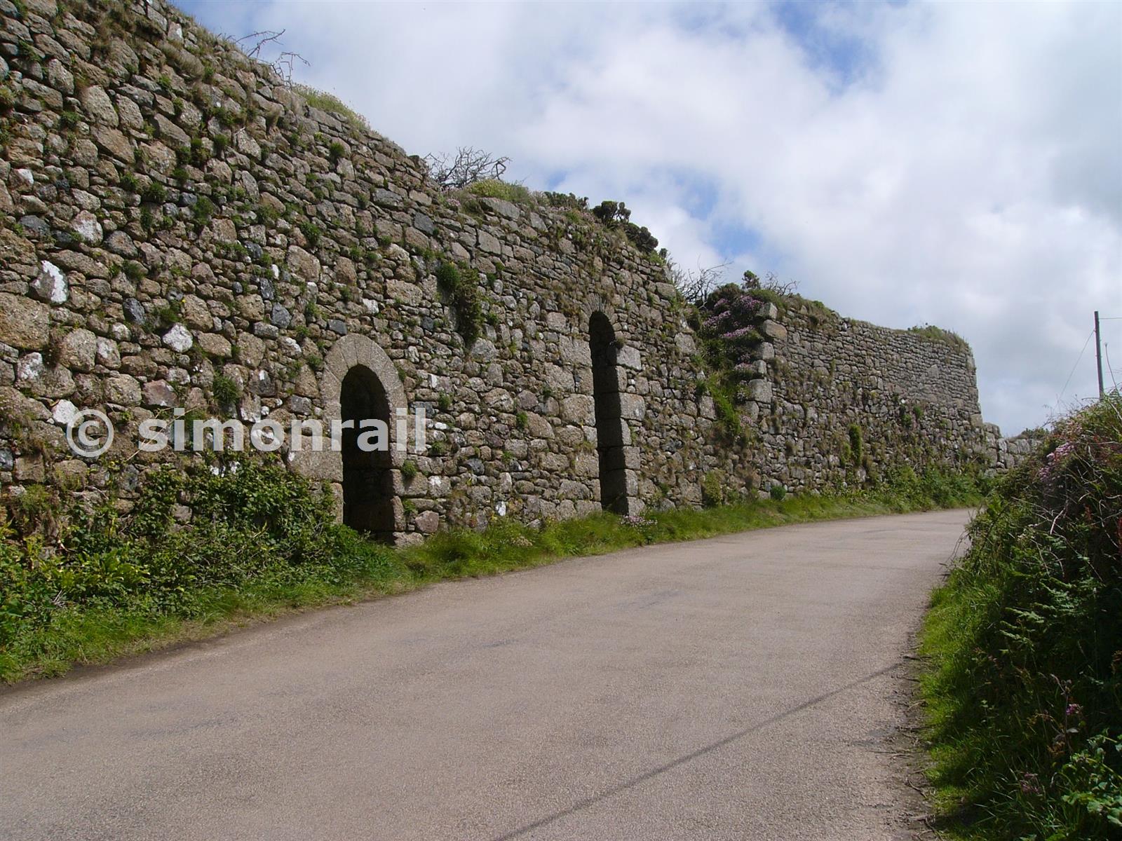 This great embankment surrounded the shaft and there are two deep V shapes (only one shown) which were for tipping the mined ore down into carts. The near archway is a passage to the shaft; the further one is a to a set of steps giving access to the top of the shaft.