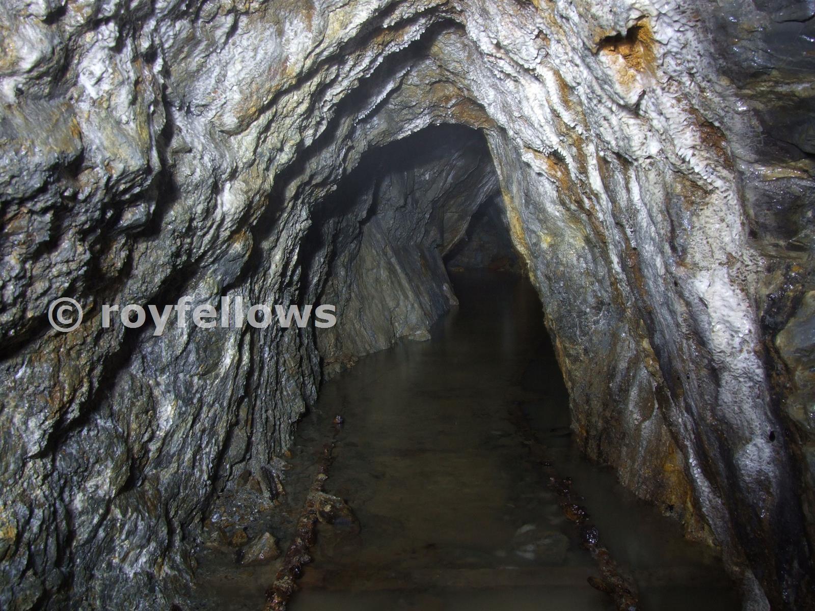 This is a view along the level from the crosscut to Williams Shaft. The level here has a low roof, in situ rails, and a lot of calcite. A companion on this initial exploration agreed that this part of the mine was very old. Unfortunately after about 50 feet progress is halted by a very substantial collapse where the vein becomes a clay filled fissure. It is possible to climb up into this to a height of about 15 or 20 feet but no way on down the other side. This area is extremely dangerous and unstable.