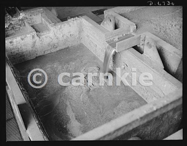 Tapping the furnace of a Southern tin smelter in which pure tin is extracted from the raw ore of South American mines. Here tin is drawn off into floats which weigh about eighteen tons when filled. The metal is then conveyed to polling kettles, where dross or skimmings are drawn off and forwarded to another furnace for re-melting Courtesy Library of Congress, Prints & Photographs Division, FSA/OWI Collection, reproduction number, LC-USE6-D-006730