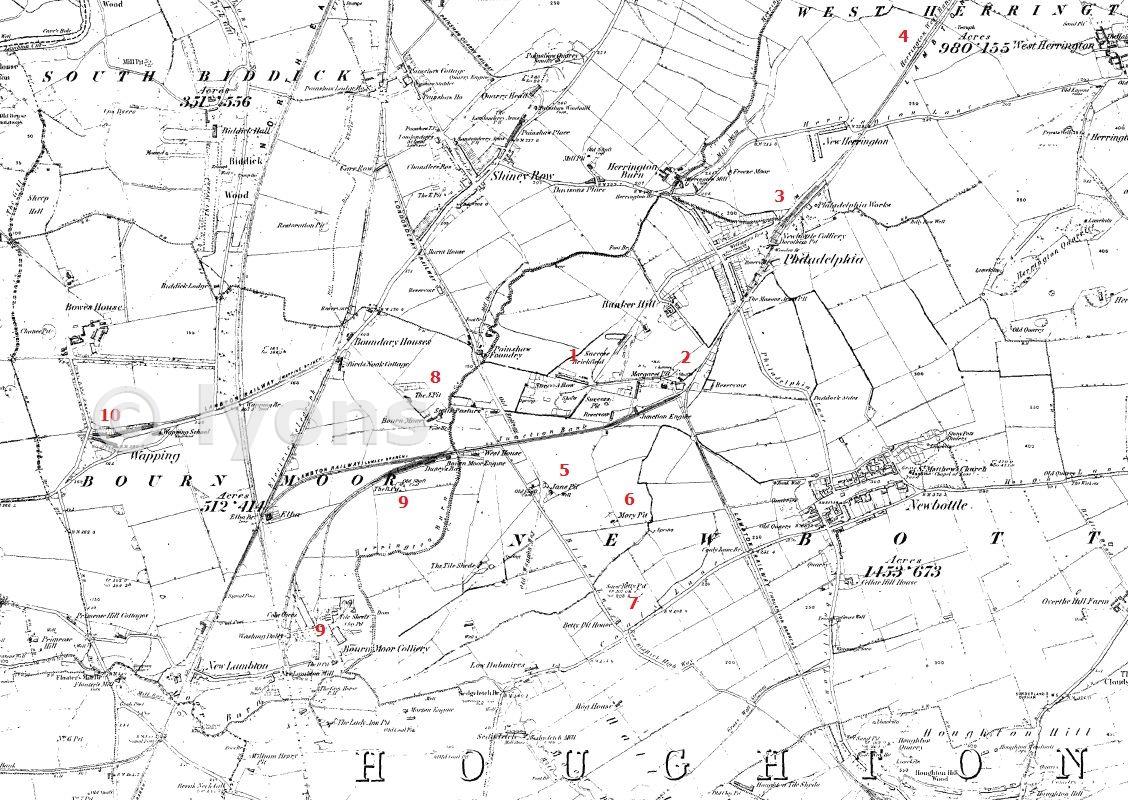 Area map showing some of the main Pits in the Area (though not all)Success Pit in the centre (1) and the other Newbottle Mines 2 Margaret (Peggy) pit, 3 Dorothea (Dolly) Pit, 4 not on the map in this year Herrington (Herrington New Pit). 5 Jane Pit Houses (not sure if this was part of The Nesham Family but it had its own railway leading upto Fencehouses, part of the old trackbed (possibly wooden rails) is still present and is used as footpath across the field next to the Sewage works. 7 and 8 possibly bell pits that lasted longer than they should? and thought to be linked with the Success Pit, this area behind the Beehive Public House is full of indentations of Bell Pits, perhaps some were left open for ventilation? 8 A pit, 9 B pit part of the Lambton Group of Mines 10 D pit which although mining would end in the 1960s The Coke works would last until the late 1980s 11 Lumbly 6th pit another that was part of the Lambton group.