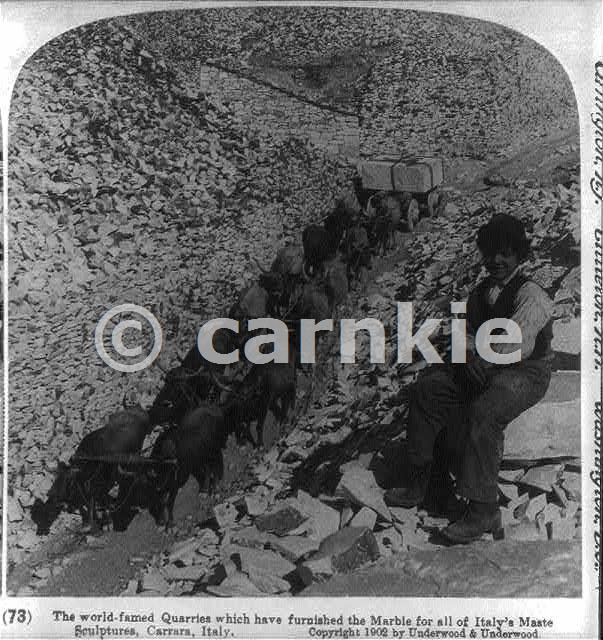 Boy seated atop quarry in foregrd.; large block of marble on ox-drawn wagon below
