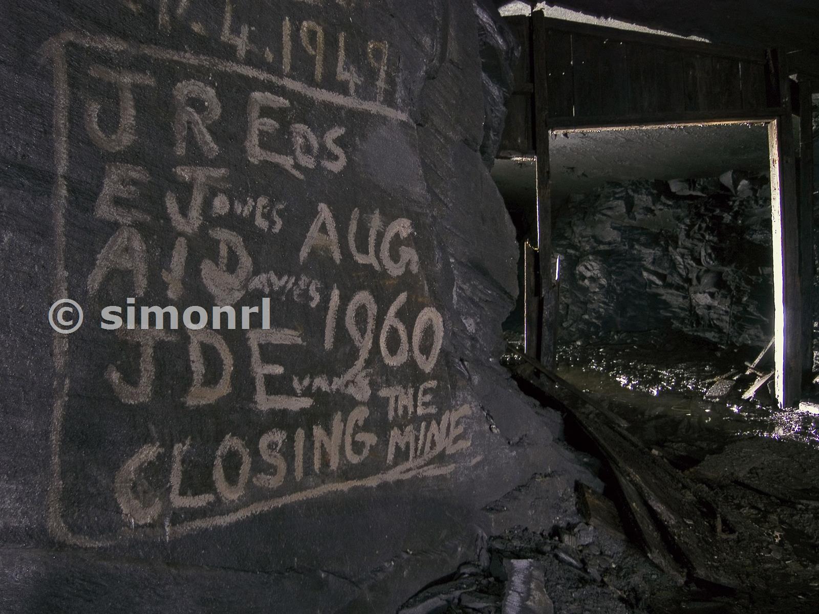 Graffiti dating from the closure of the mine in 1960, floor 5 Moel Fferna Slate Mine May 2010