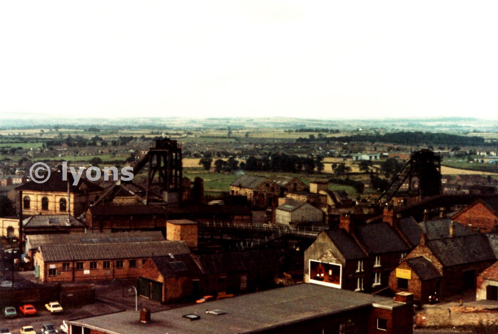 The chimneys have been swept away along with some buildings The Upcast shaft (right) appears similar to the original one but is much taller but has tiny pulley wheels and has also received a new Winding House of corrugated construction (white building off centre to the right) just above it is the fan housing possibly Walker type next to the double buildings which housed the compressor/ workshops. Near the main entrance looks like the Pit Baths? Some housing has been cleared and also the roof of the Comrades club can be seen at the bottom.