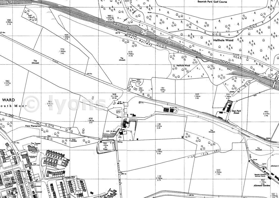 The mine is almost cleared away but a few buildings remain including the Sub Station, The site was then used as a small Industrial Estate. However since the date of the map it has all been swept away and a light landscaping has taken place. The Old shaft is still shown on the map near Gibside Close Housing Estate, a new road has been built between the shaft and the housing.