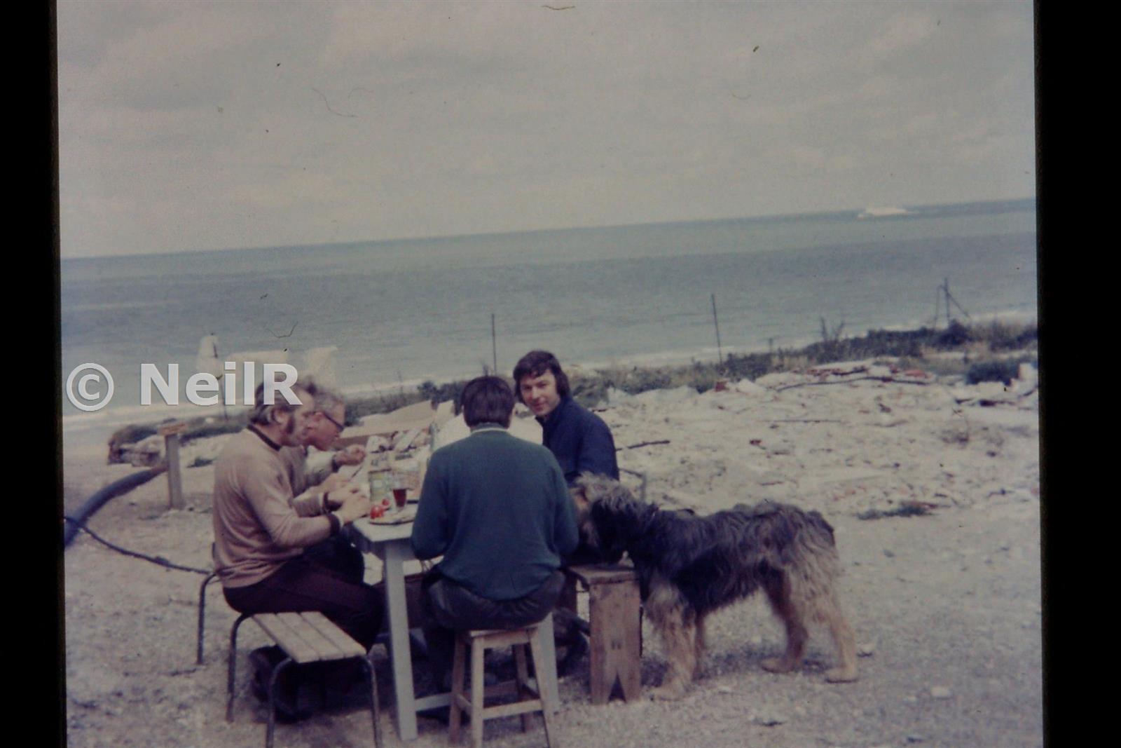 Newcastle University Rock Mechanics department dining in style on the cliff top. Lunch was cooked on site by ''le patron'' from the hotel, who always brought his dog.
