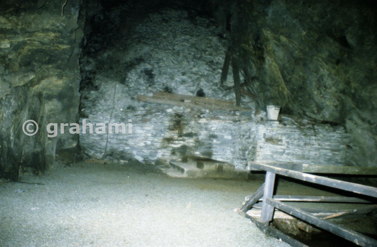 This chamber was the site of the Incline down to D floor. The railings in the foreground are round the flooded shaft. In front of the wall are the mounting blocks for the later winding gear. The remains of the floor B bridge timbers can be seen on the tip behind the low retaining wall.
