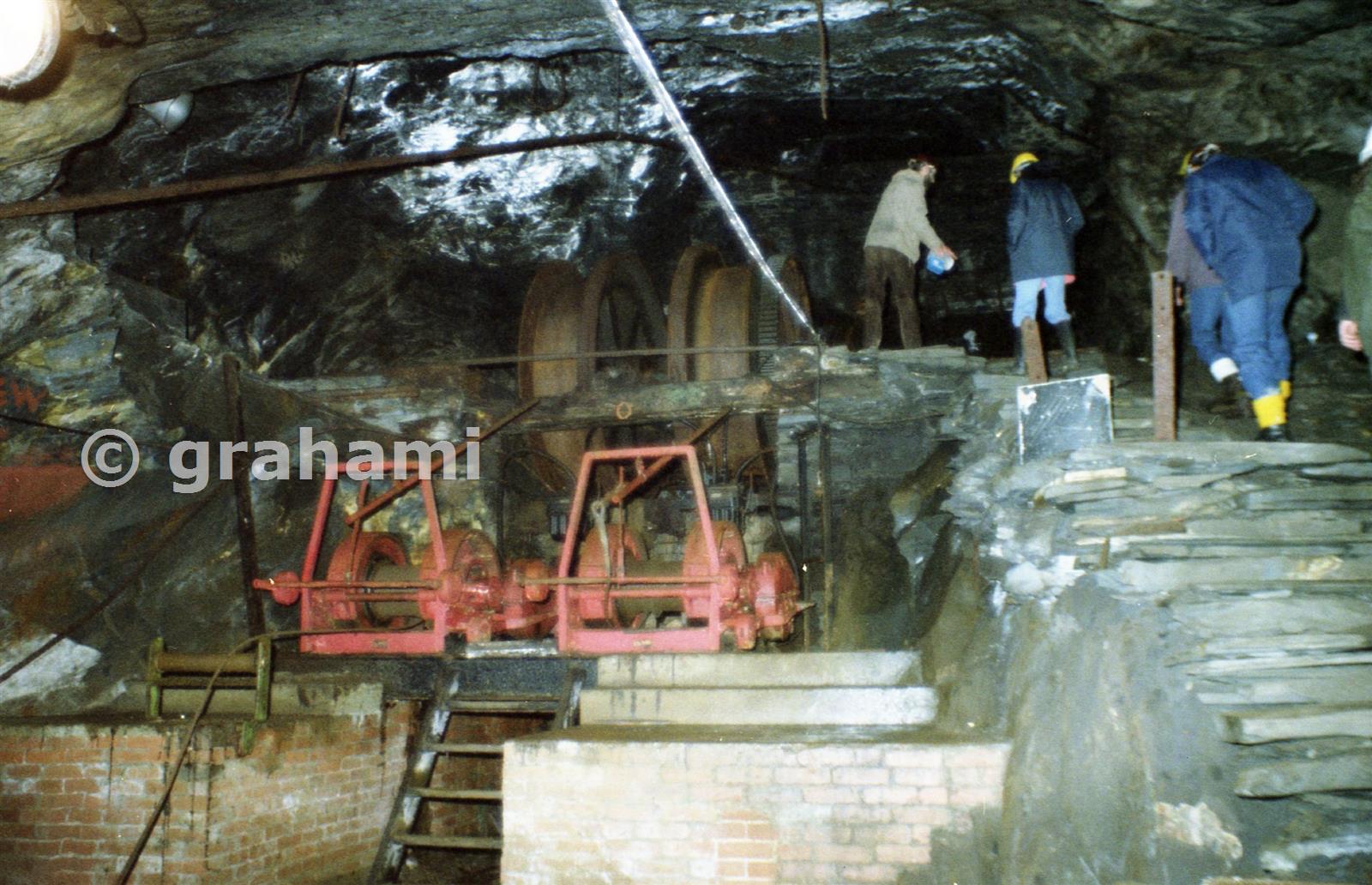 The Red winding gear was installed by the Ministry when the mine was taken over for storing explosives. Behind it are the drums of the original Robey semi-portable winding gear. This was originally installed at the top of the old Incline shaft above Floor D (Upper) being brought down to this site by Moses Kellow, the hair raising incident being described in his autobiography.