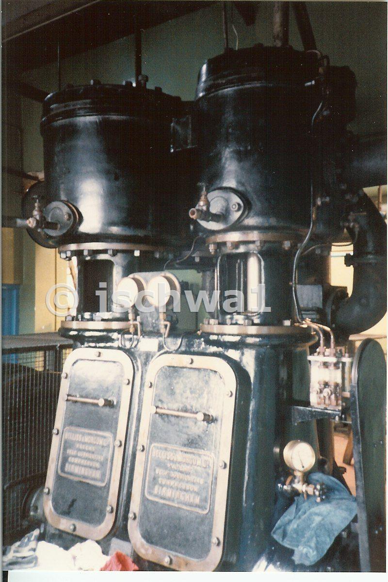 One of the compressors in 1988. I think both were Bellis & Morcom and dated from 1930 and 1938 (if I remember correctly). You can see that they were lovingly cared for. Very different to the way the look in the demolition photos from 2009.