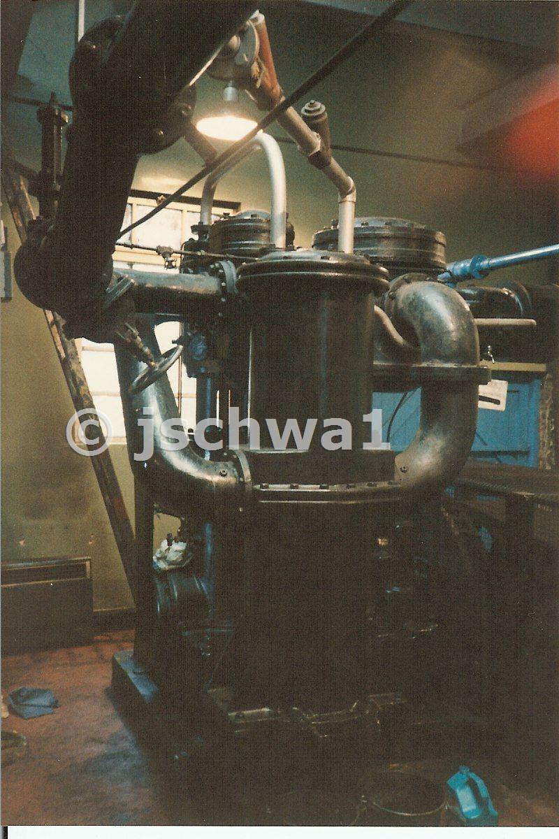 One of the compressors in 1988. I think both were Bellis & Morcom and dated from 1930 and 1938 (if I remeber correctly). You can see that they were lovingly cared for. Very different to the way the look in the demolition photos from 2009.