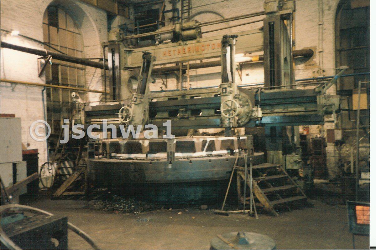 Vertical borer dating from ~1919 (I think) due to it's age one head could only do vertical cuts and the other do horizontal. I think the table was 19' diameter and when turning, Ralph Bilbie, the operator, used to travel round on the turntable sweeping off the swarf.