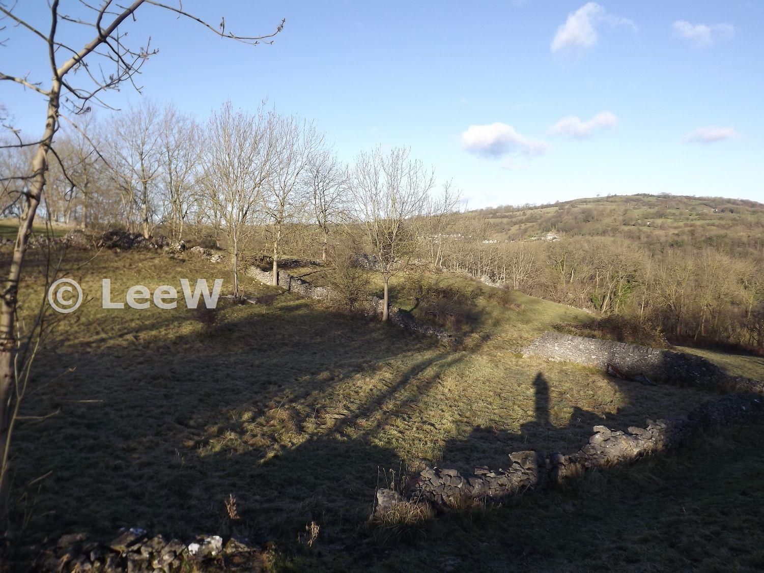 View of two shafts of Hit or Miss Mine. One is located below the tree to this side of the wall and the other is in the shurbs on the otherside of the wall (December 2012)