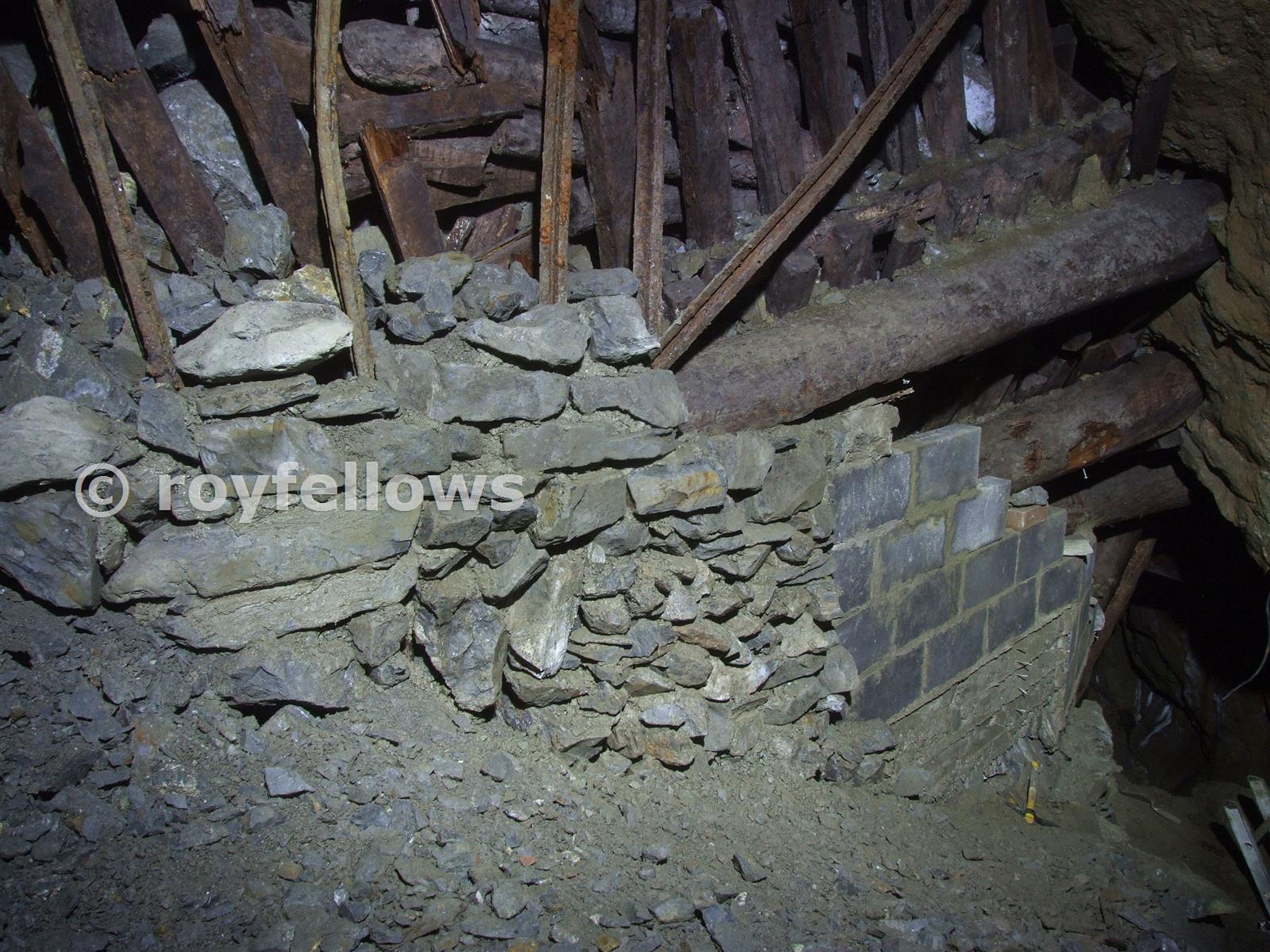 Rails have been wedged at the top behind a timber and concreted in at the bottom to retain deadwork where the original timbers have rotted. Packwall will be extended down to cover blockwork. The jack has now been removed.