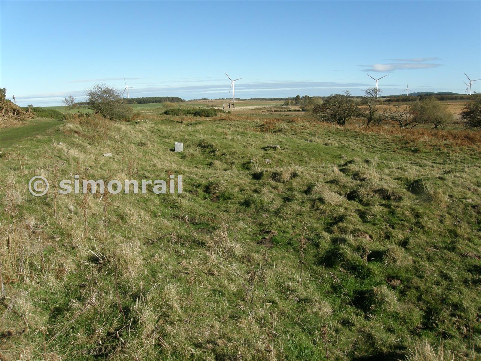 Looking east across the outline of several buildings and a shaft or two to two adjoining engine houses.