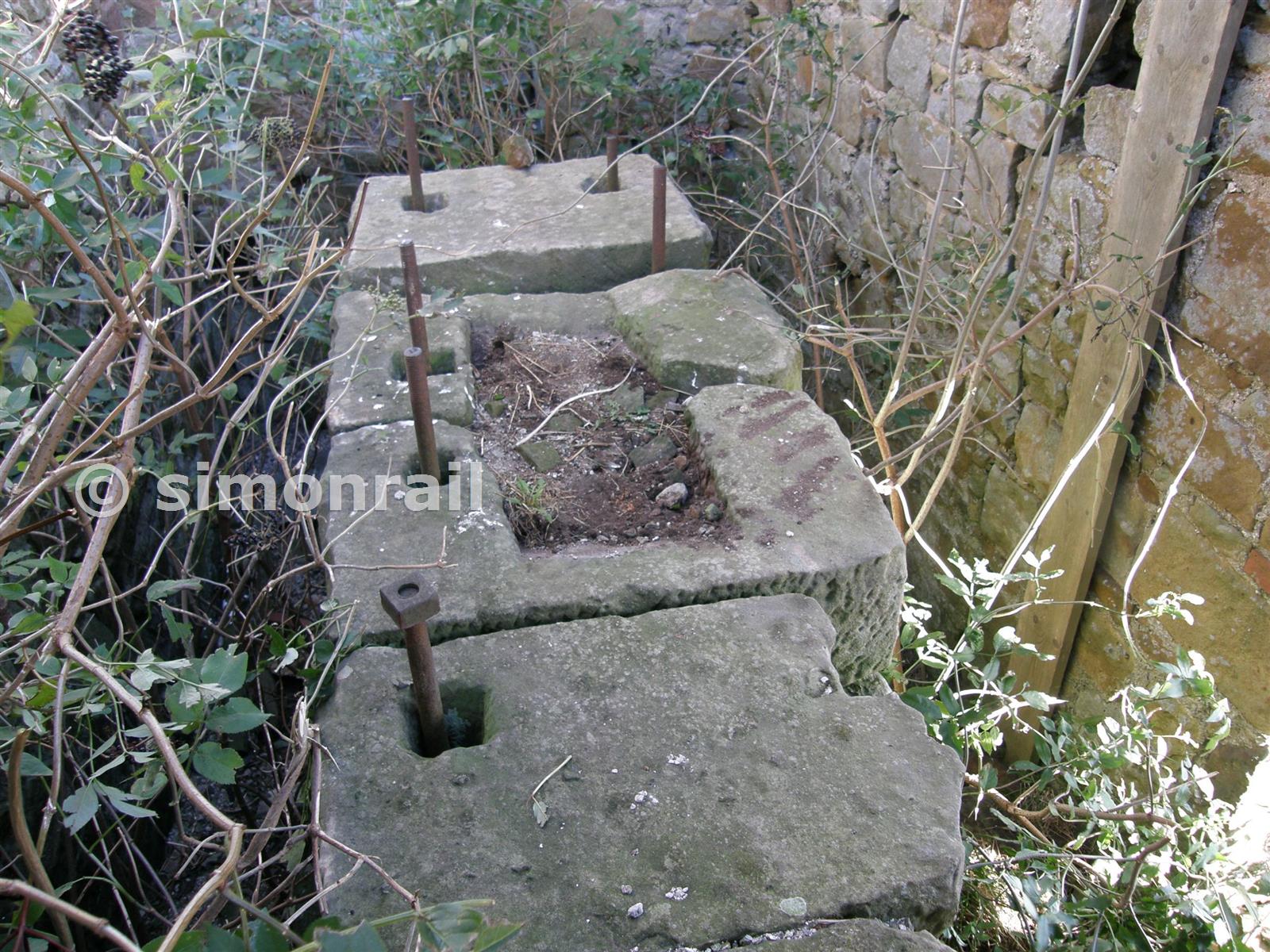 Engine bed within engine house with crank pit suggesting some form of vertical engine. Bearing in hole in wall to right. View away from shaft.