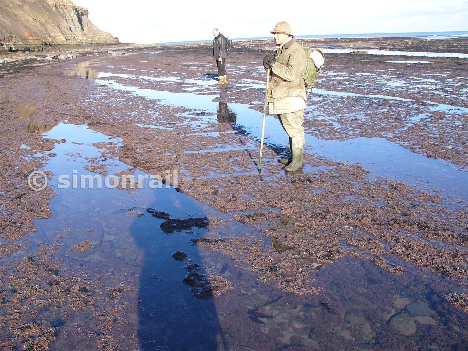 The bottom of John's staff marks the imprint of a sleeper with others beyond to where Dave is standing. Part of a foreshore tramway from quarry to drift.