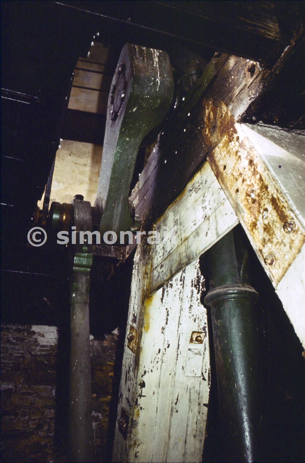 View from below of the A-frame supporting the inside end of the drum and crankshaft.