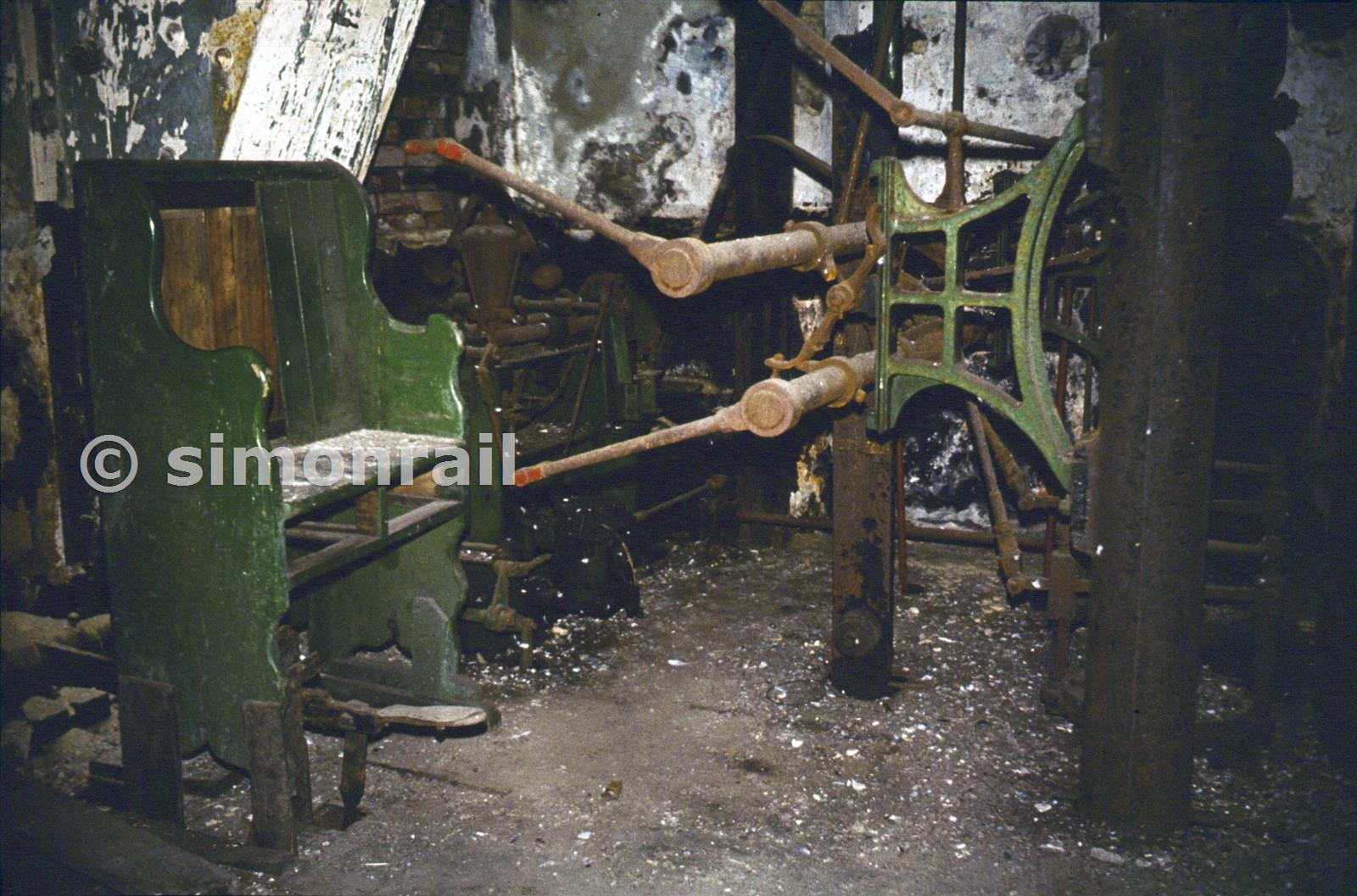 Winding engineman's position with the valve controls directly in front and footbrake beneath his seat. Governer and slow banker to right of seat.