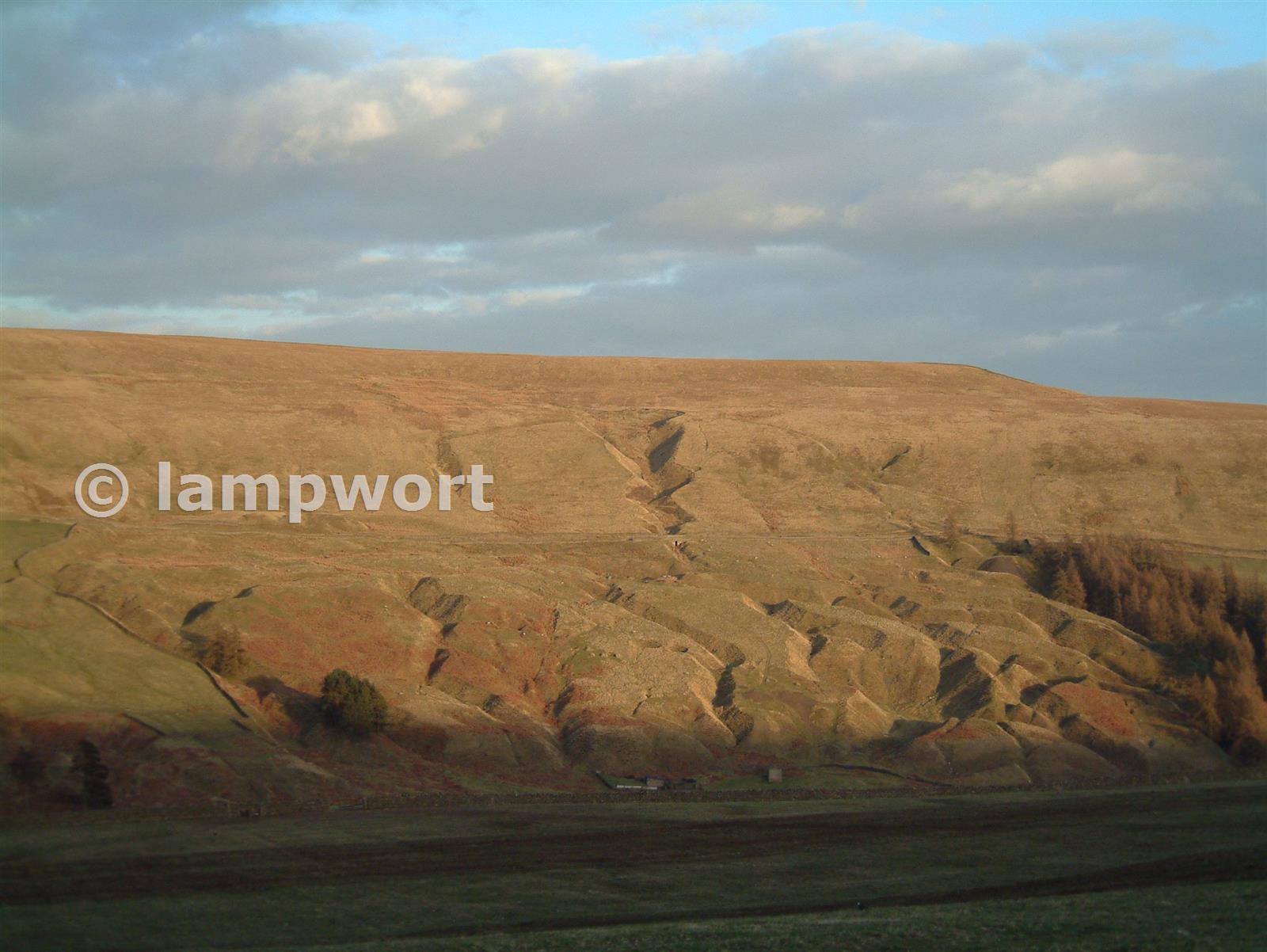 The setting sun reveals either High Skears Mine tailings or hushing. Seen from Coldberry