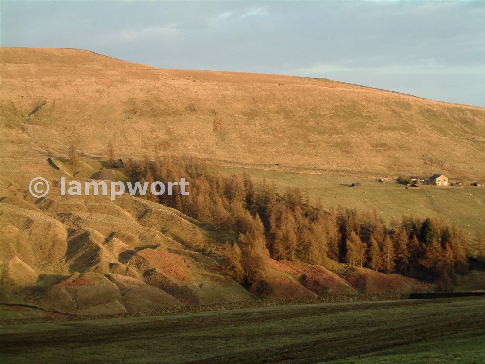 The setting sun reveals either High Skears Mine tailings or hushing. Seen from Coldberry