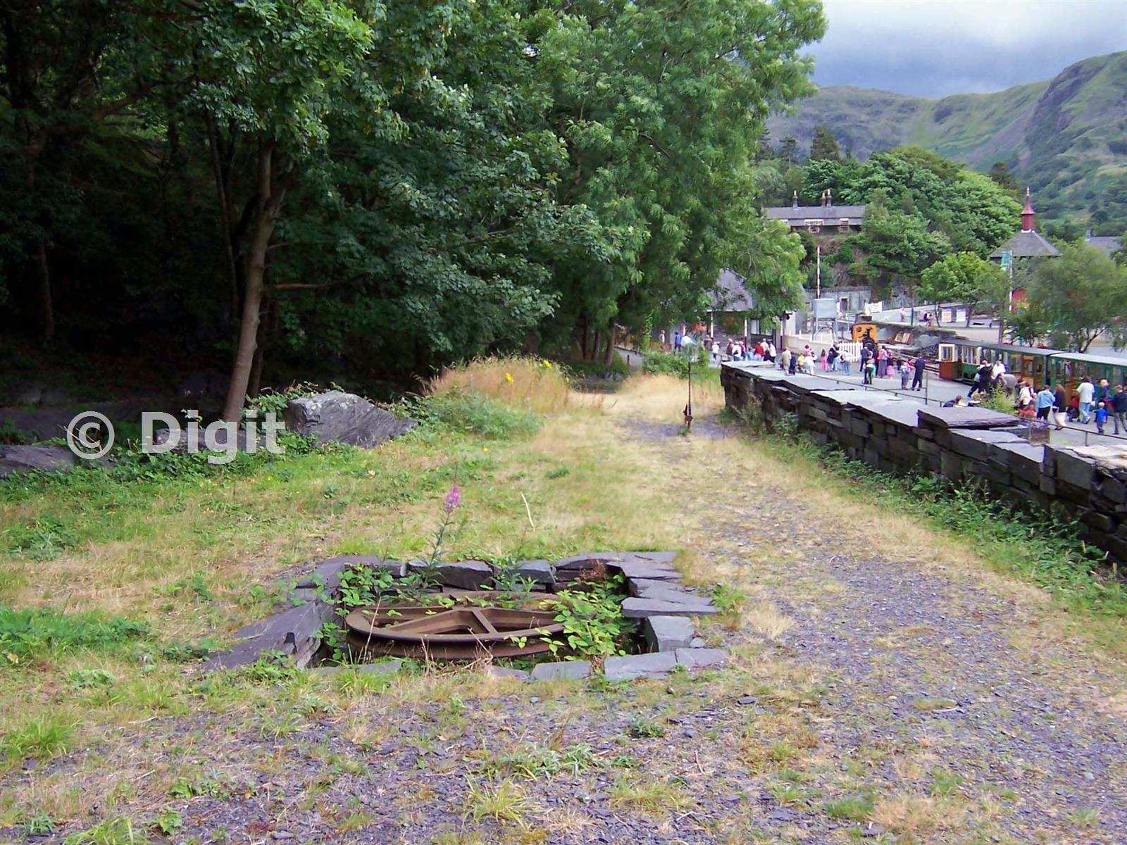 The lowest of the Vivian inclines (V1) ran down from near the base of the (preserved/restored) V2 incline to the transfer dock (now destroyed) approximately where the grey water tower of the Llanberis Lake Railway now stands. Little now remains except the sheave and leaver.