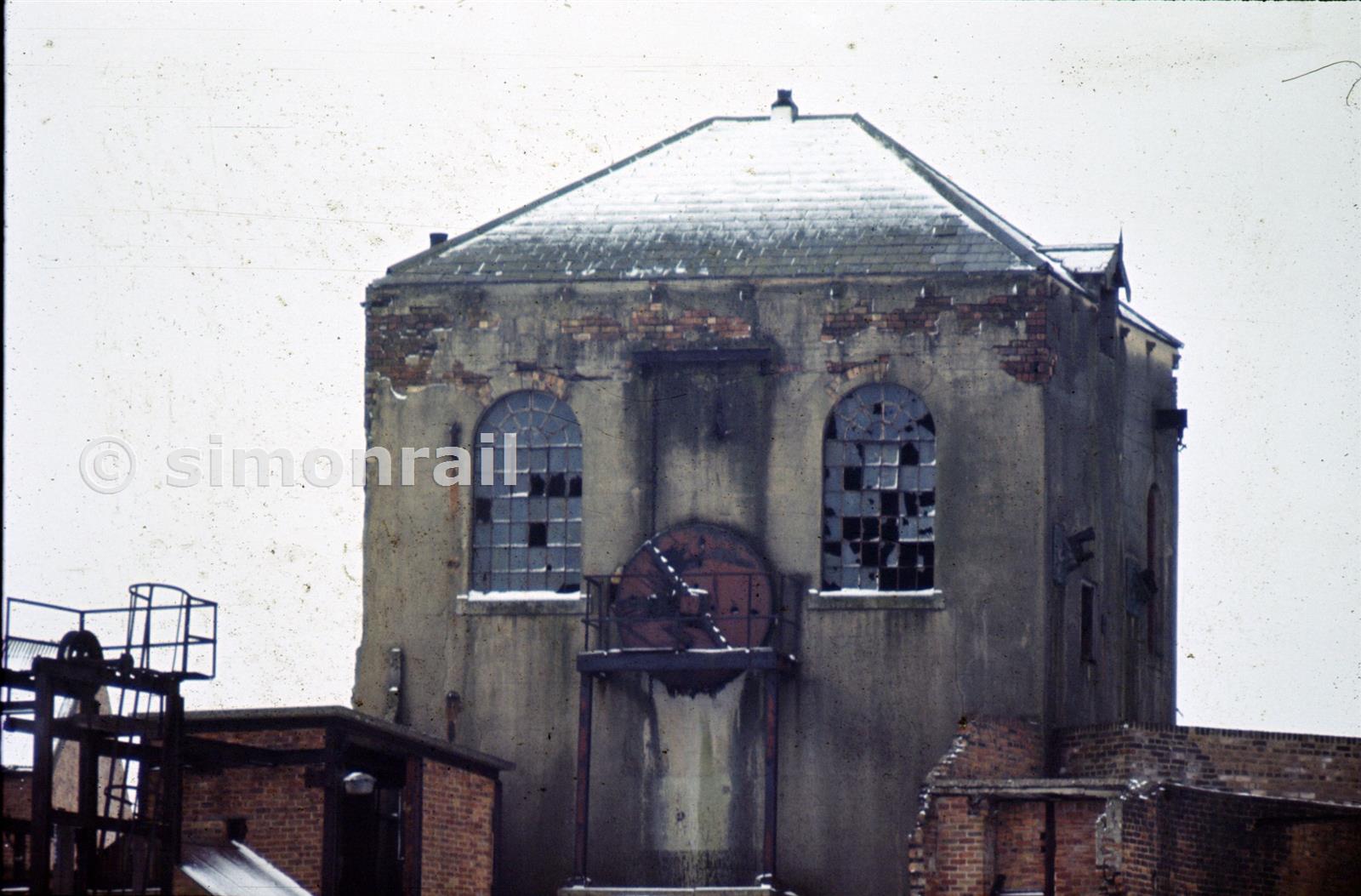 A close-up of the house still containing (at the time) the Isabella vertical winding engine. The circular drum on the side was for the counterbalance chain.