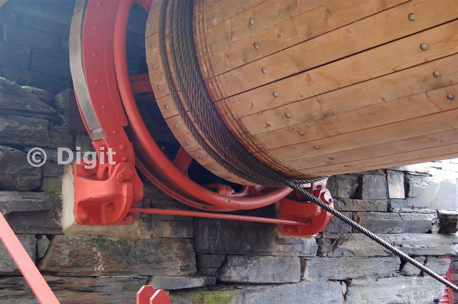 View of the caliper brake. Braking arrangements differ from drumhouse to drumhouse this caliper is not typical of the Vivian Quarry. The rest of the brake mechanism is out of sight (and photography) in the brakemans cabin at the side of the drumhouse.