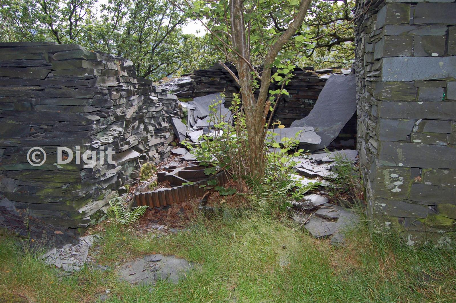 A broken brake mechanism gear wheel lurks in the undergrowth of a derelict gwaliau.