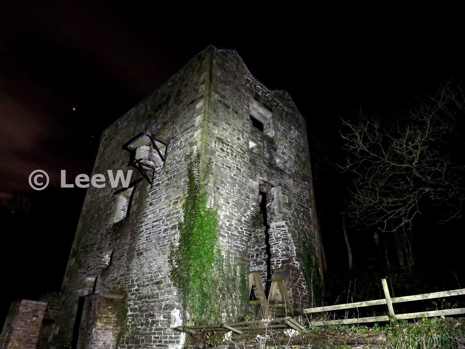 View of the engine house at Snailbeach taken and night with the engine house light painted.
