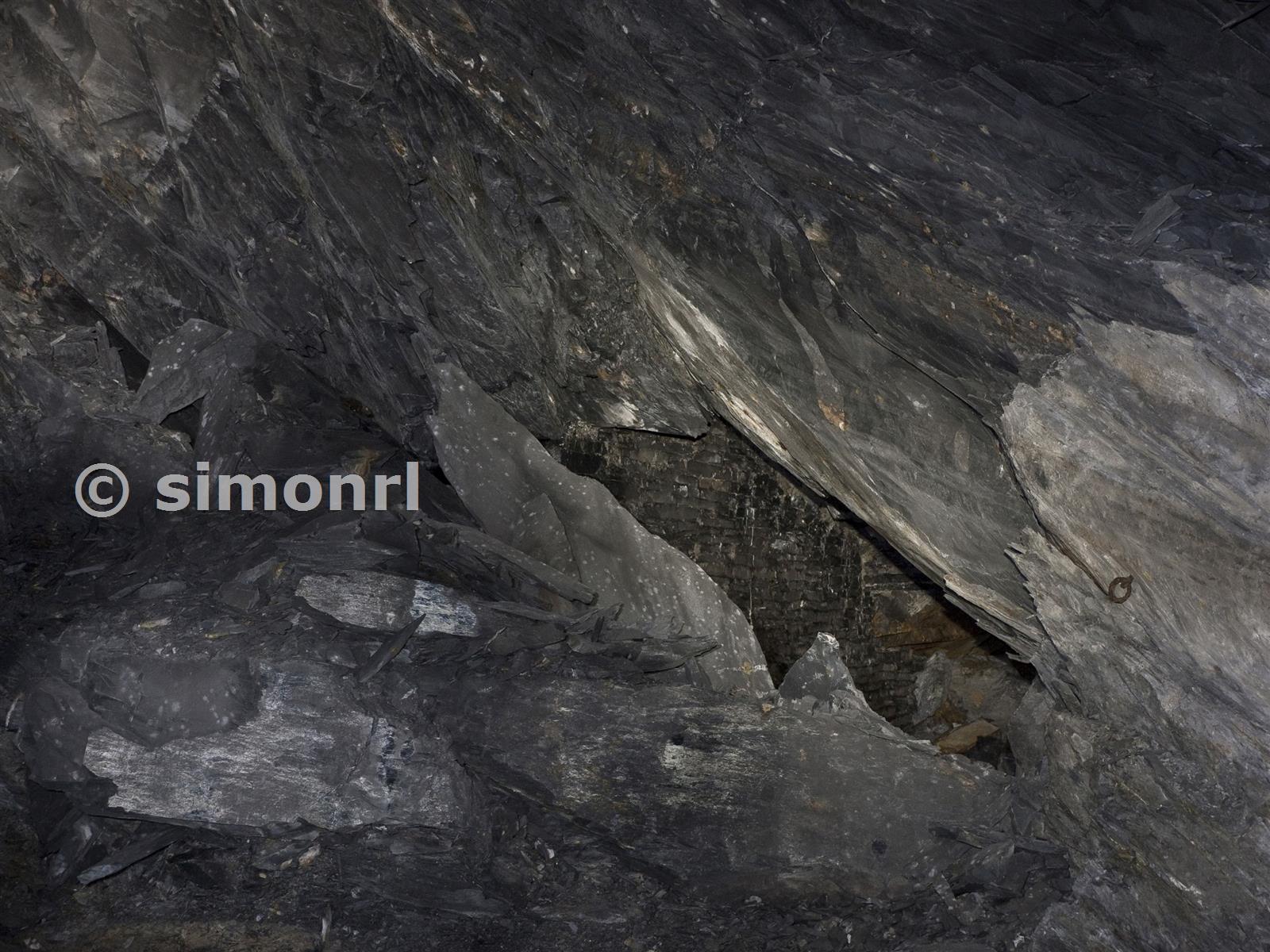 Slate block wall visible through hole in A2E Croesor Slate Mine July 2011
