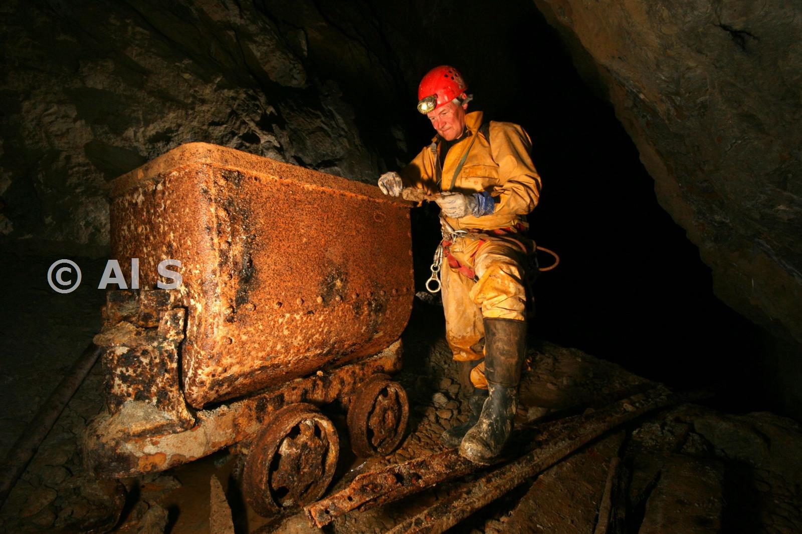 Dick Gerrish examining abandoned cart in Greenside mine.