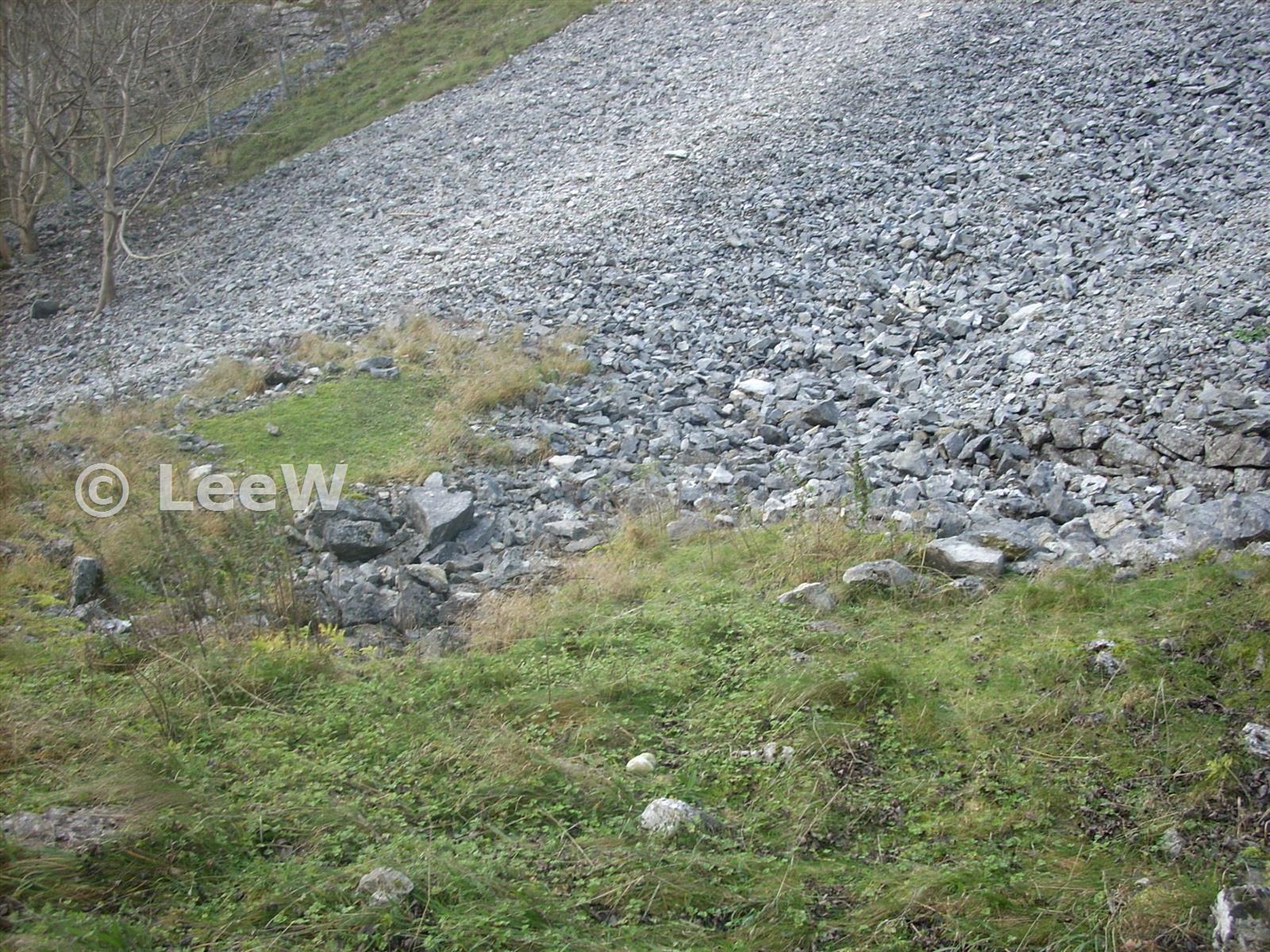 Rectangular feature covered by scree, compare this photo to the historic 'dig' photos