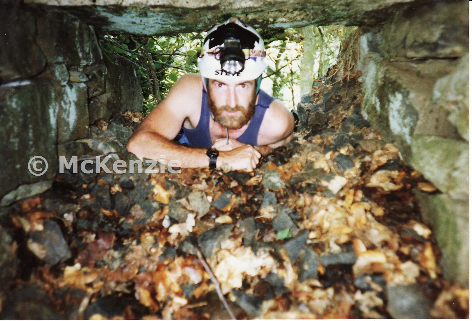 Looking out of the adit as Steve Wadlan enters. This adit suffered a colapse shortly after this photo was taken, whilst we were underground, we made a narrow, very narrow escape. 1990.