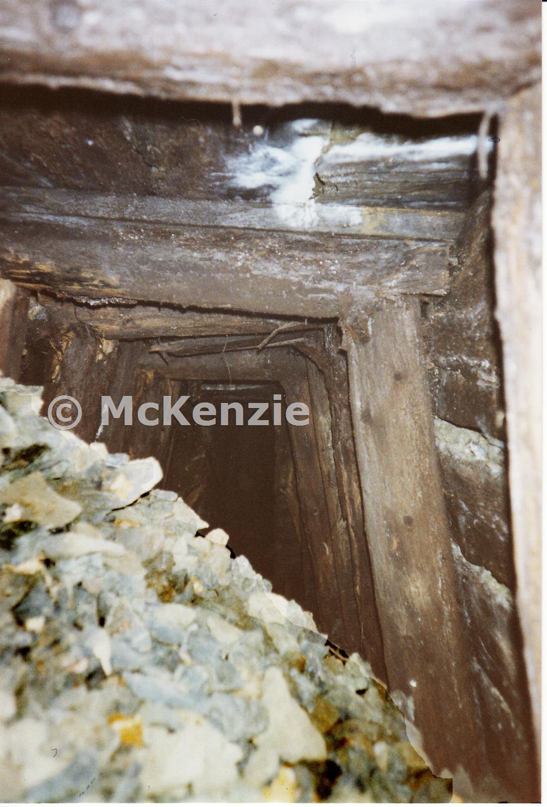This adit had a partial colapse about 5yards in from the adit mouth, you can see fractures in the roof timbers above the fall. We cleared the fall enought to gain entry, after going past the fall a short distance the roof started to coalpse and we ( Alan Tomlin and I) just manage a hurried escape before it colapsed totally! 1990.