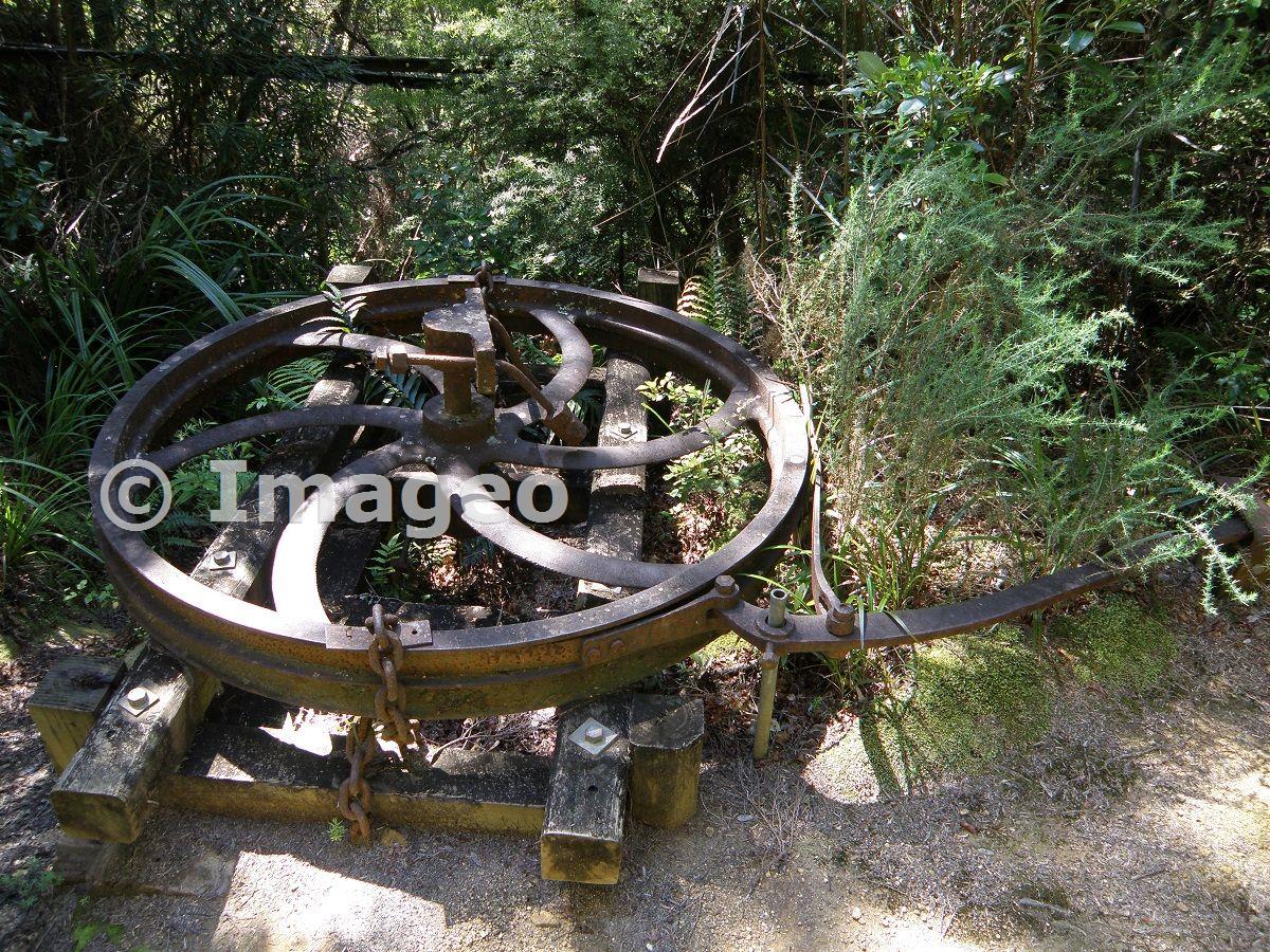 The upper ropeway wheel for the Bendigo Battery ropeway. The end of the old spur line can be seen in the background, the wooden hopper has long since rotted away.