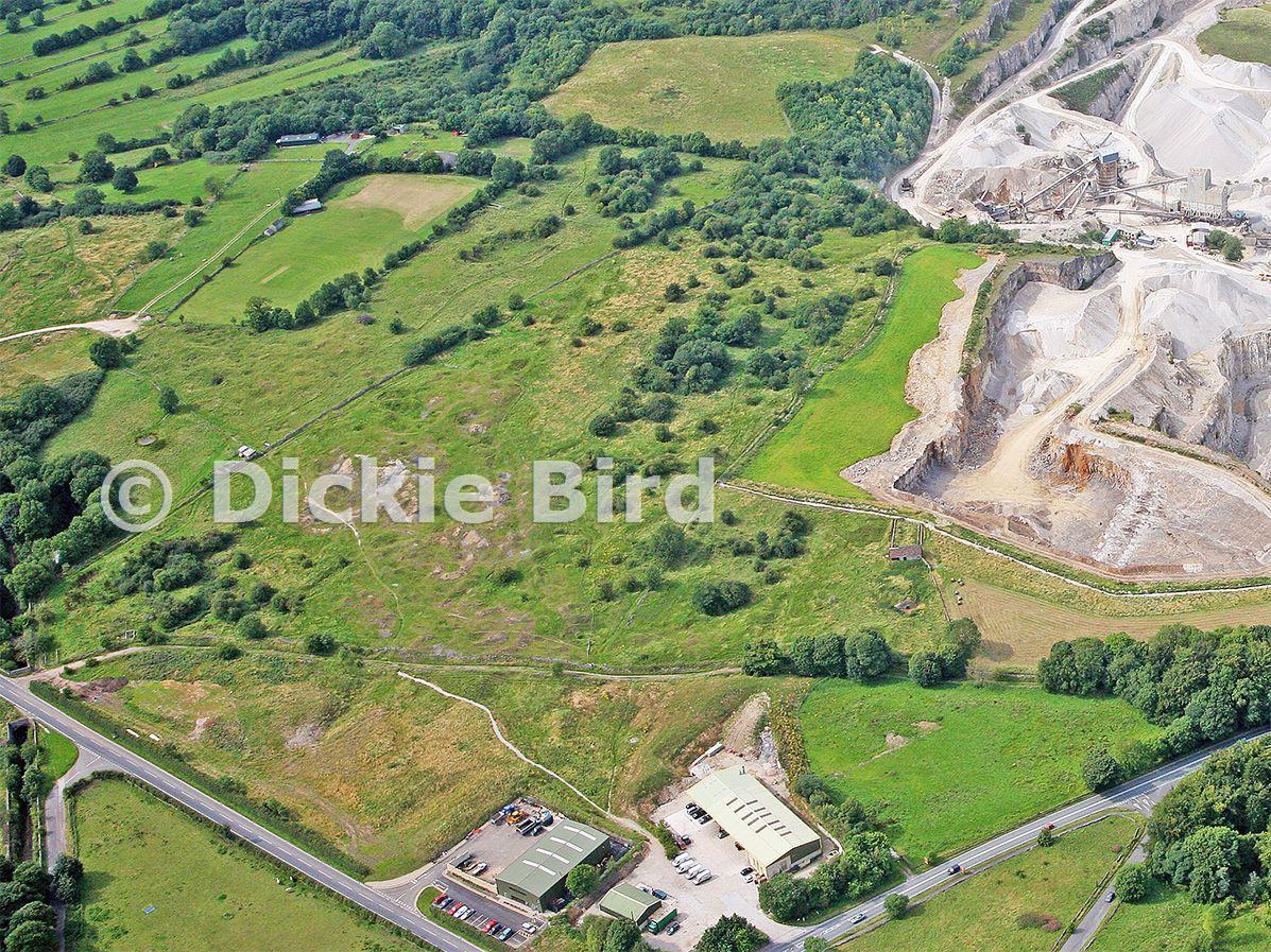 The surface remains of these important mines are rather disappointing and have been slowly obliterated over the years, particularly recently with the building of two new depots (bottom). The shafts and hillocks are on the hillside, left of centre. Modern Dene Quarry (part of) to the right. Killers Branch of the old High Peak Railway is in the cutting, bottom left
