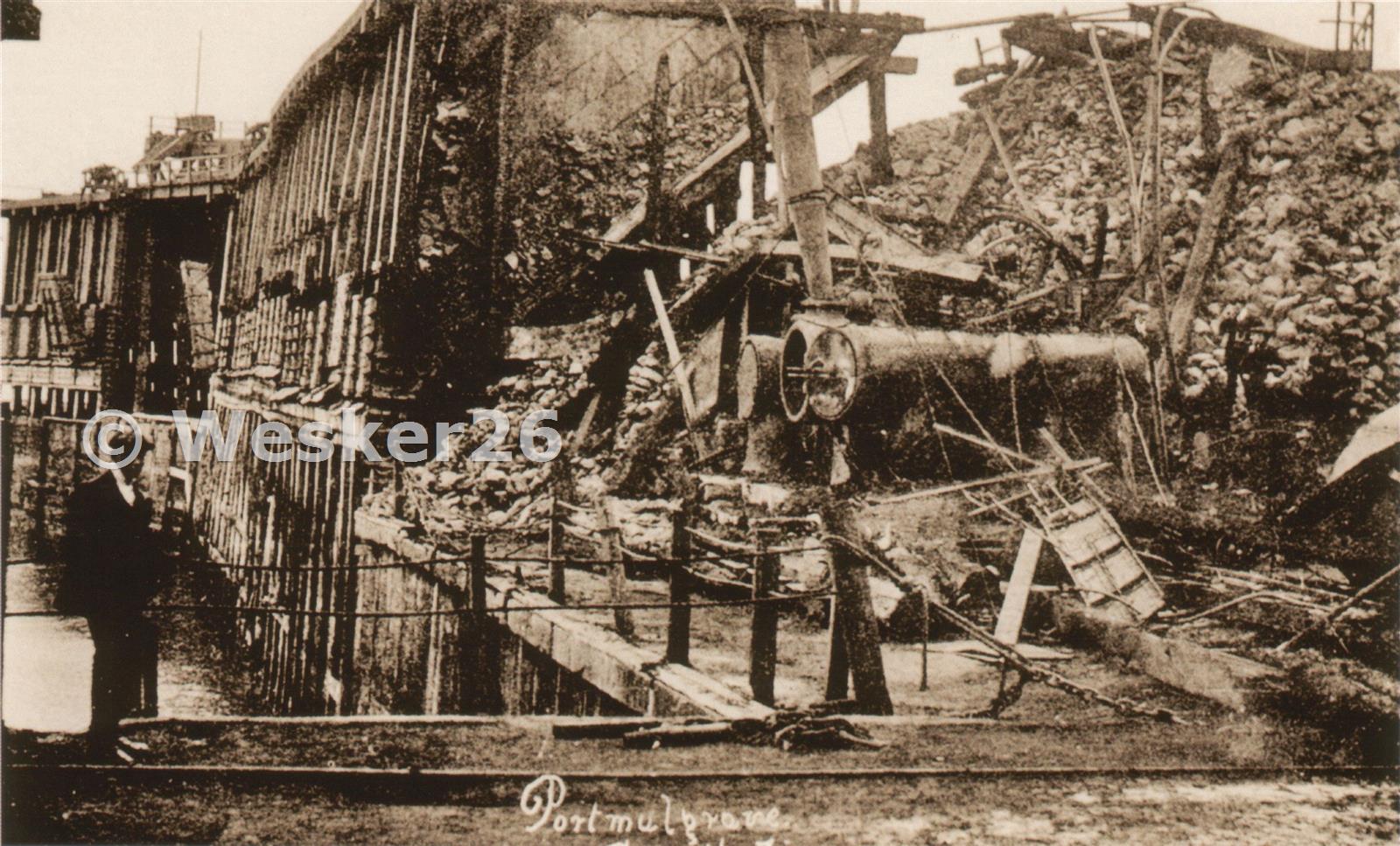 A better view showing the destroyed engine room and boilers for the rope haulage system, the fire has also exposed a section through one of the bunkers for loading ironstone into ships in the harbour.