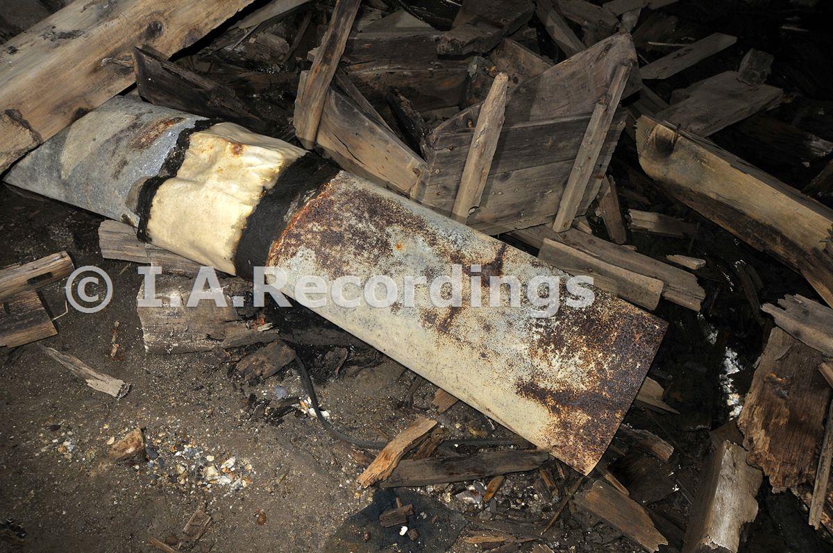 Air bagging or ventilation ducts (1950s) amongst the debris in the Man Engine Chamber (South East & West Lode). [October 2012]