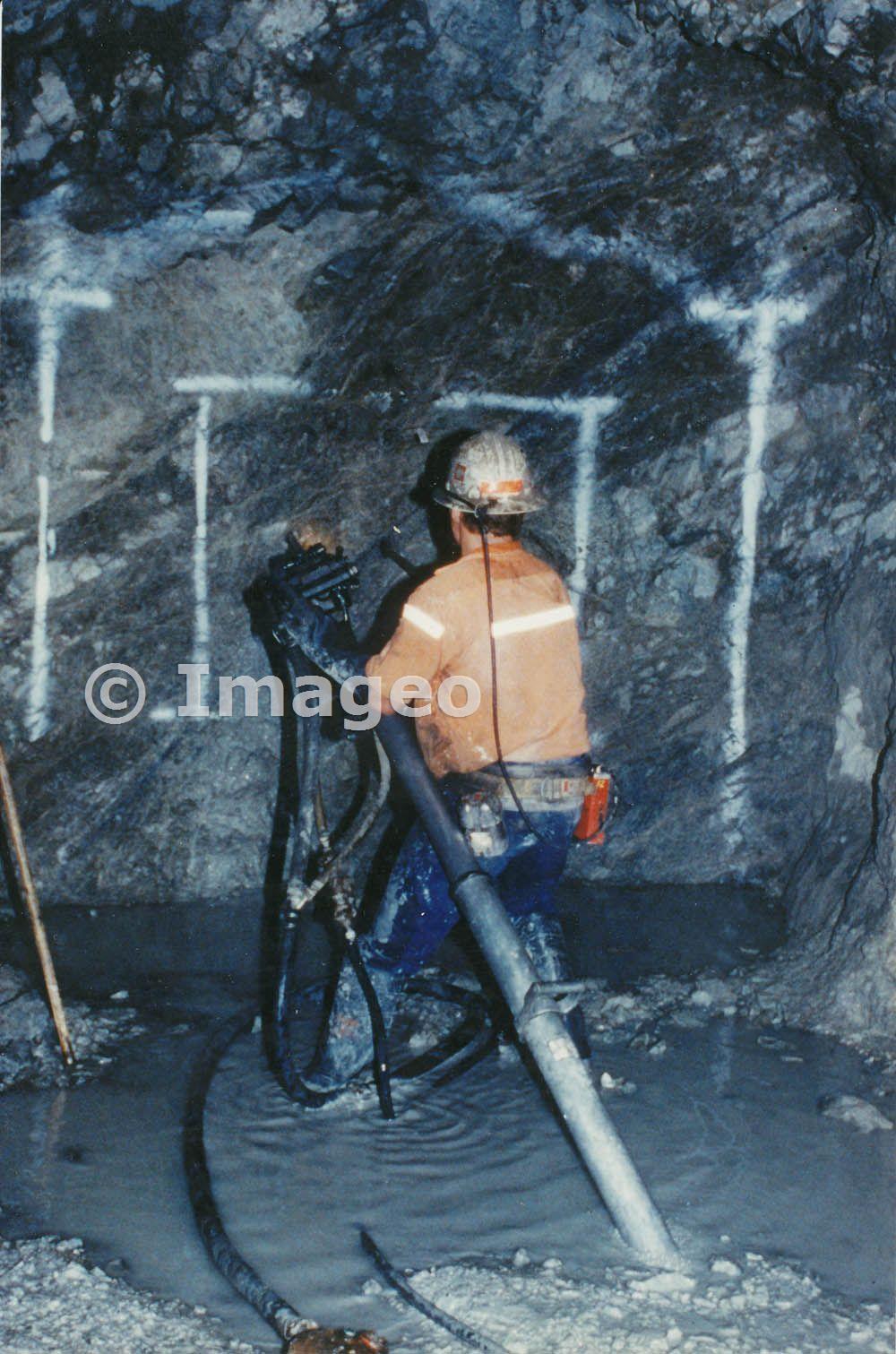 An air leg miner driving on one of the hanging wall lodes. Lode is seen dipping from top right to lower left of face.