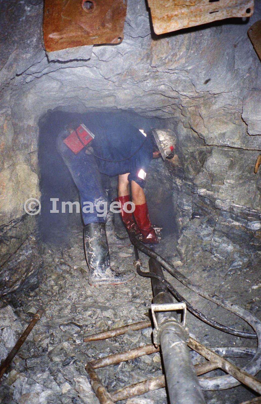 An air-leg miner rising on a gold bearing quartz lode which is visible in the lower half of the rise. This is probably above 2 level on one of the shallow-dipping hanging wall lodes.