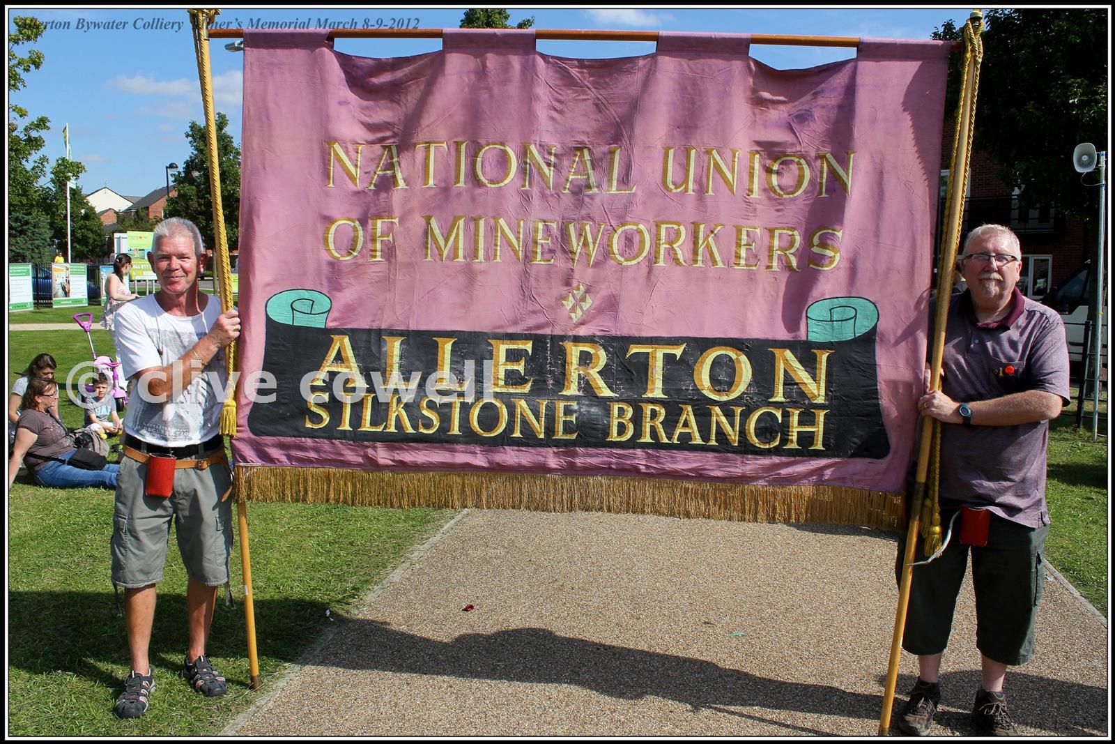 Allerton Silkstone Banner in use in the 1960's. It is currently on Display in the Long Gallery at Northern College, Barnsley. L - R Karl Curry former Ledston Luck NUM Branch President and Mick Bednall whose father worked at Waterloo Main Templenewsam and Allerton Bywater Colliery