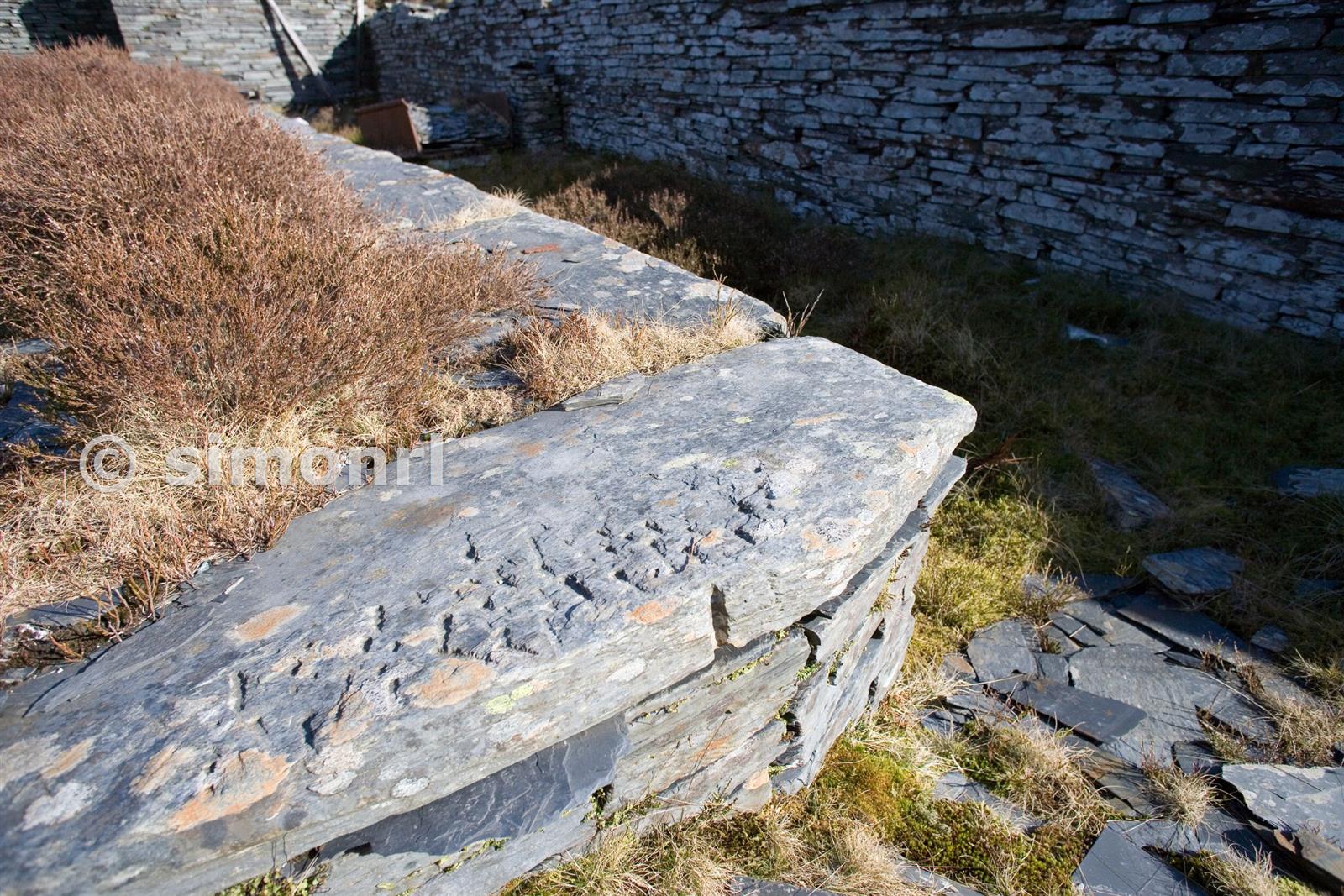 Angled slate slab where waste was loaded into rubbish wagons in the Diffwys mill Diffwys mill March 2010