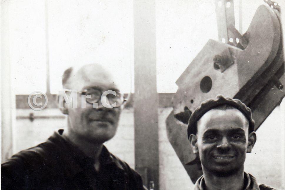 Foreman Blacksmith Joe Oakes & his striker Warren Embling beside newly annealed detaching hook. Taken late 1950s. At this time several N. Staffs pits sent their cage tackle to Sneyd for annealing, inorder to prevent failure due to work hardening.