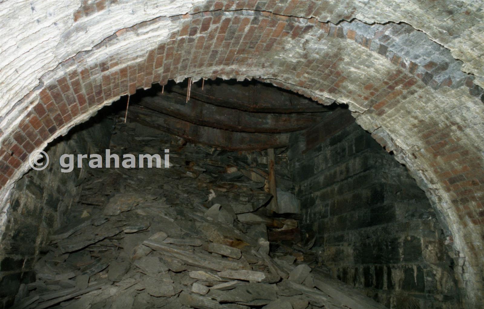 This was the end of the level - you can see the original brickwork and the later masonry, with the girders overhead to support the incline.