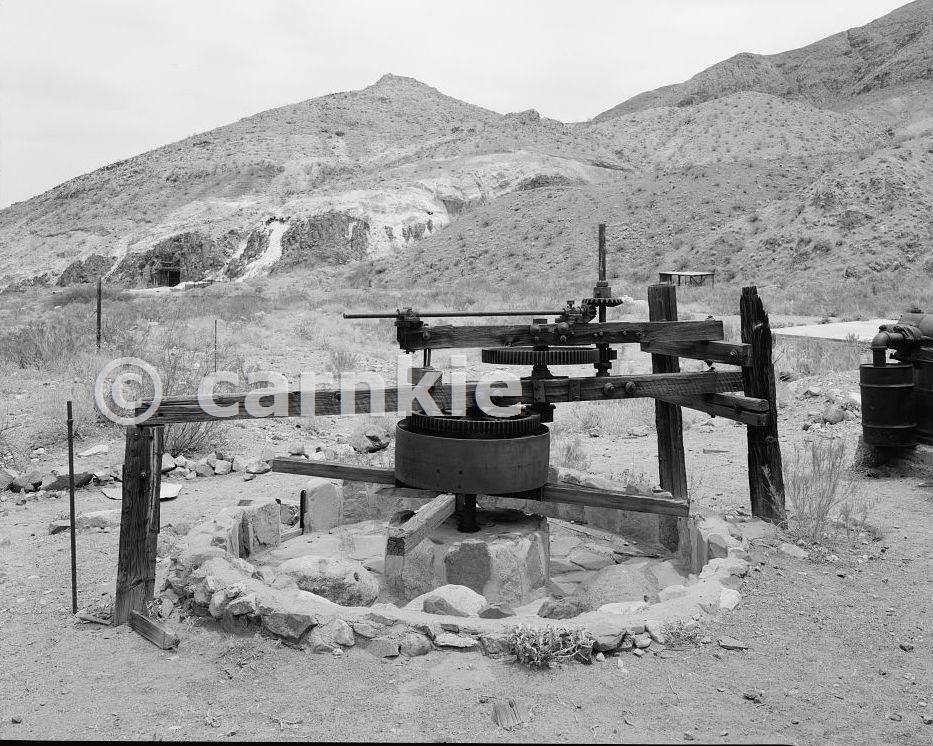 Arrastre was turned by a belt that connected to a missing wheel on the shaft just above the wood beam. Courtesy Library of Congress, Prints & Photographs Division, HAER, Reproduction number HAER CA-292-15