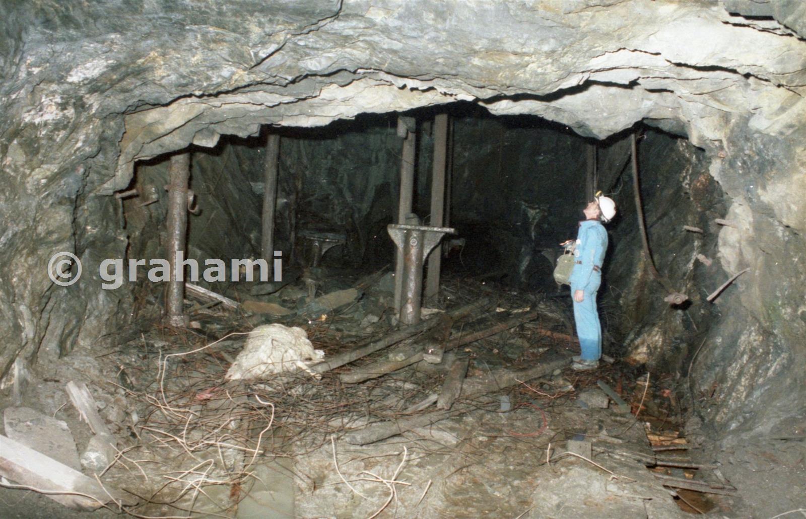 Will looks up the shaft towards the surface at Bonc Siafft 282ft above him, surrounded by the broken remains of the shaft foot structure. As far as it is possible to tell this is almost identical to the foot structures found at Penrhyn Quarry. Unfortunately I didn't measure the bits at the time!