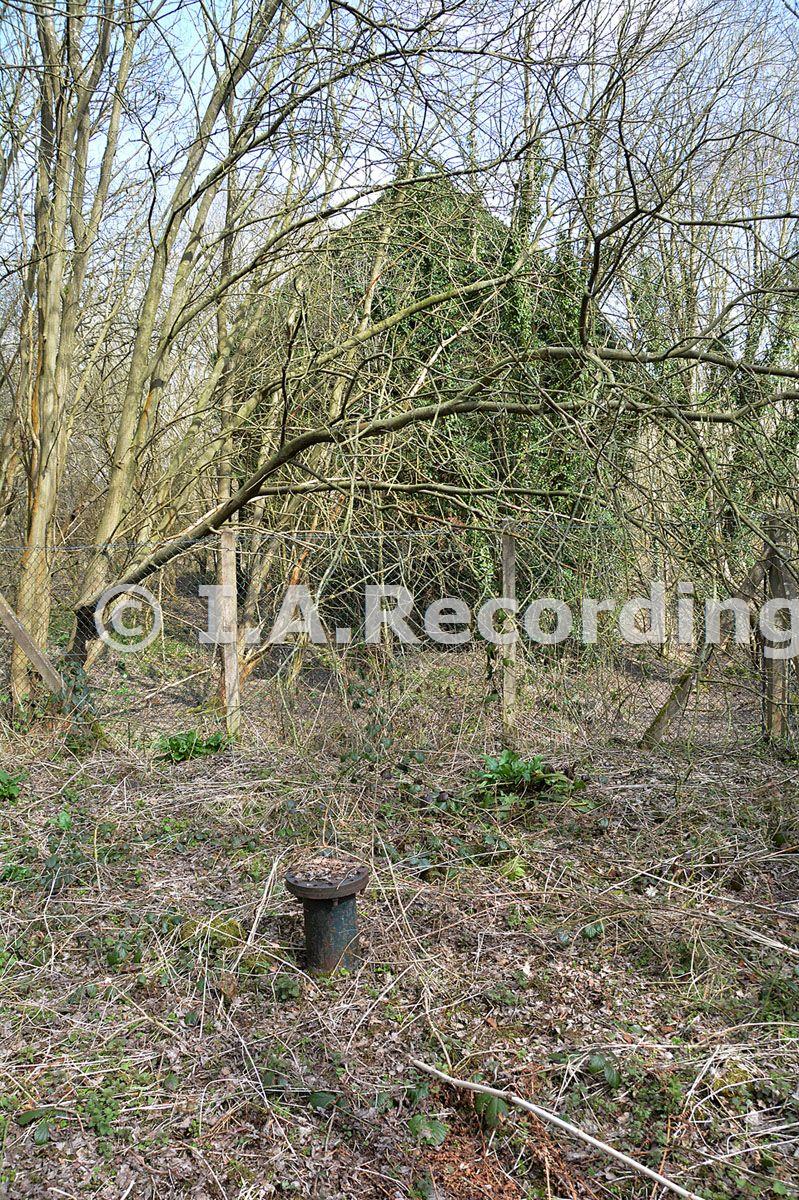 The capped top of 'Back' shaft looking Northwards to the site of the fan house and the rear of the large 1896 steam winding engine house.