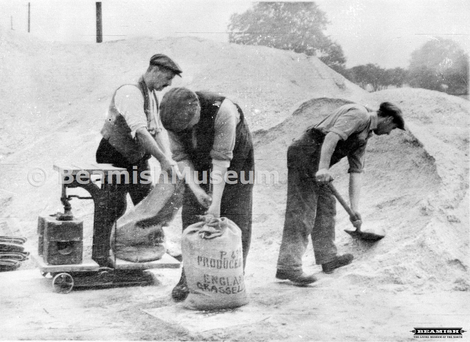 Bagging dressed witherite for export in 2 cwt bags, Settlingstones Witherite Mine. Date c1930, from the Beamish Museum Photo Archive.