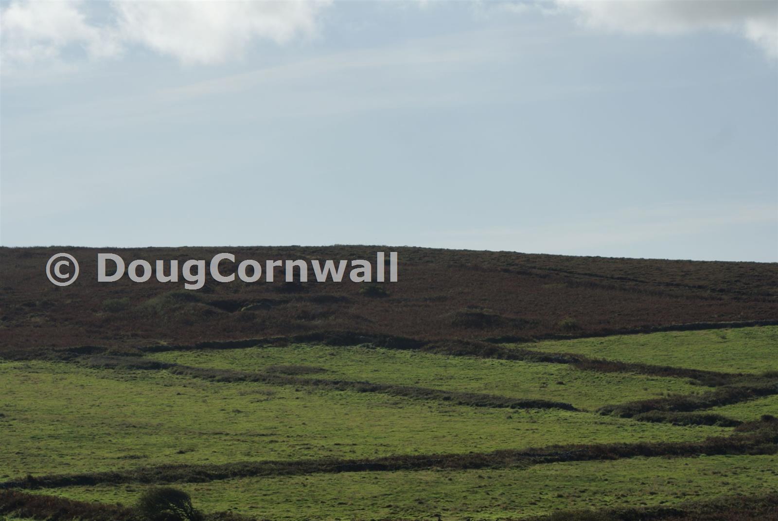 Photo shows Bartinney Downs as it is in 2009. The adit began in the hedge at the bottom right of the picture. Water still issues. The opencast pits run up the hill. The lower shaft is just into the roughage on the right over the hedge and the upper shaft near the top of the hill.
