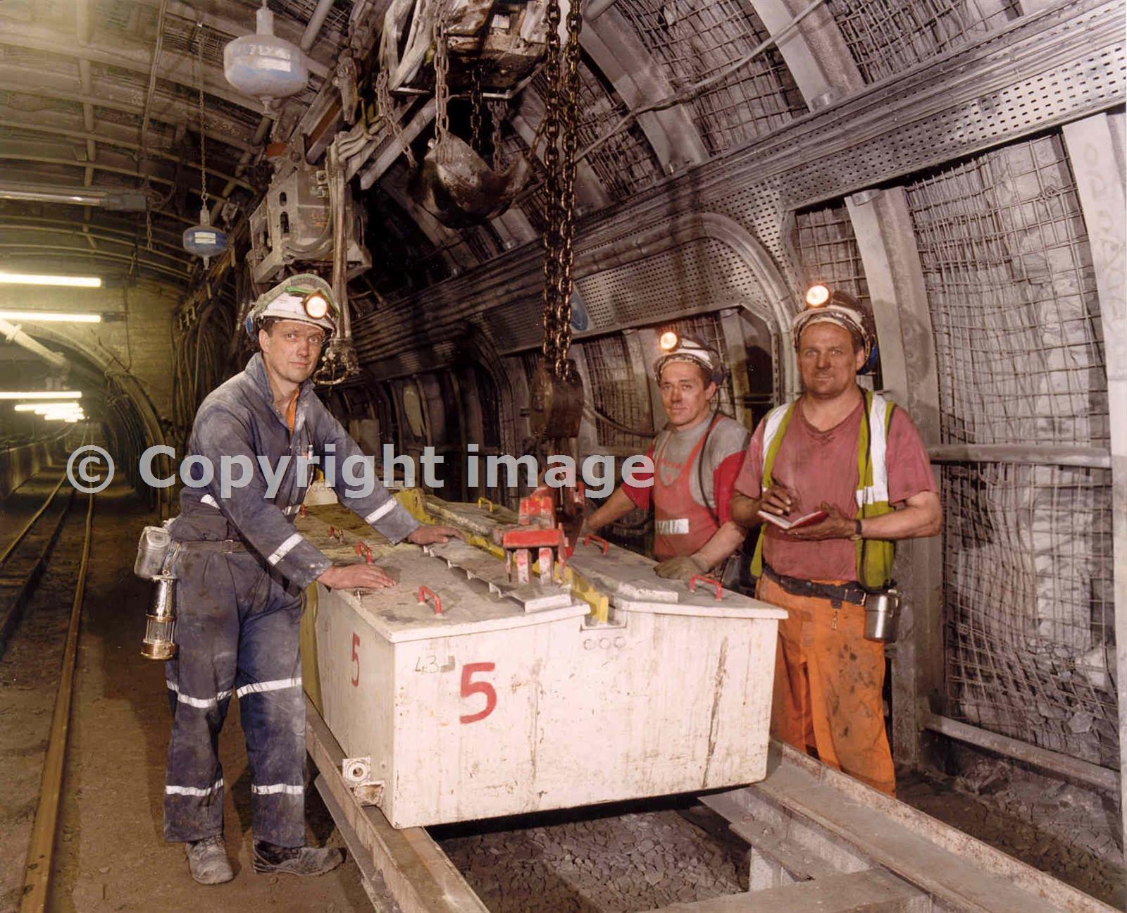 Bottom of the North Drift, probably 1995. Neil Rowley, Paul Phelan and Tommy Wingate. Note the rack track for the diesel locos. The Clayton battery bobo locos were rubber tyred and didn't need the rack.